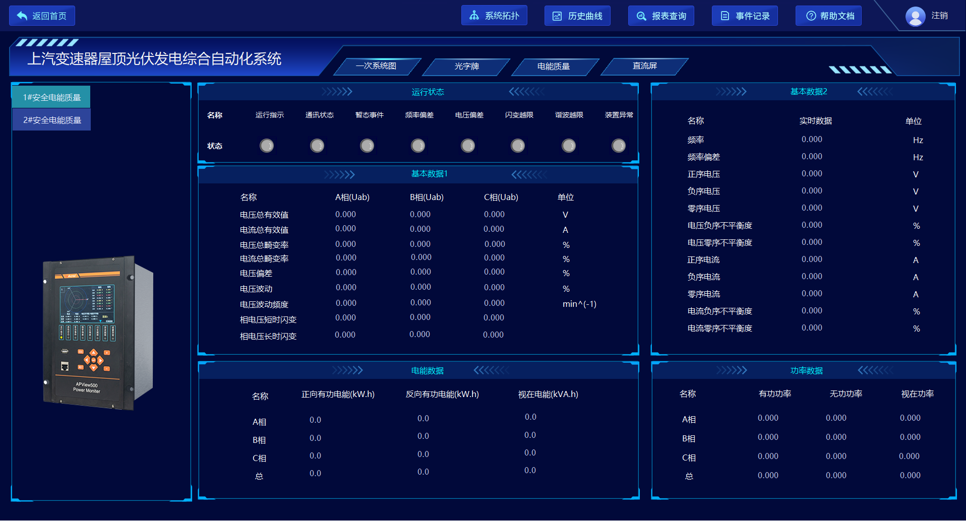 電能質(zhì)量在線監(jiān)測裝置采集#1、2#光伏并網(wǎng)接入點(diǎn)的電能質(zhì)量信息,可以對整個(gè)供電系統(tǒng)的電能質(zhì)量包括穩(wěn)態(tài)狀態(tài)和暫態(tài)狀態(tài)進(jìn)行持續(xù)監(jiān)測。系統(tǒng)界面實(shí)時(shí)顯示裝置通信狀態(tài)、各監(jiān)測點(diǎn)的A/B/C相電壓總畸變率、三相電壓不平衡度百分比和正序/負(fù)序/零序電壓值、三相電流不平衡度百分比和正序/負(fù)序/零序電流值,幫助管理人員實(shí)時(shí)掌握供電系統(tǒng)電能質(zhì)量情況,以便及時(shí)發(fā)現(xiàn)和消除供電不穩(wěn)定因素。