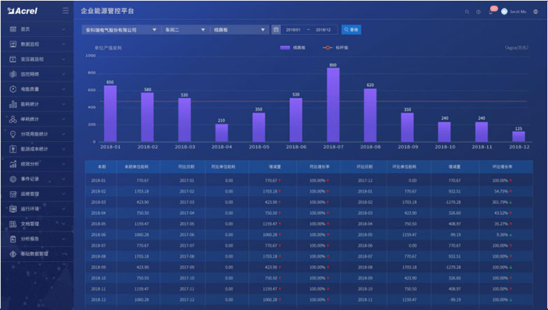 與企業(yè)MES系統(tǒng)對接,通過產(chǎn)品產(chǎn)量以及系統(tǒng)采集的能耗數(shù)據(jù),在產(chǎn)品單耗中生成產(chǎn)品單耗趨勢圖,并進(jìn)行同比和環(huán)比分析。以便企業(yè)能夠根據(jù)產(chǎn)品單耗情況來調(diào)整生產(chǎn)工藝,從而降低能耗。