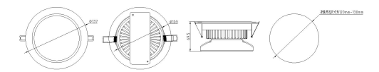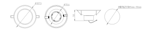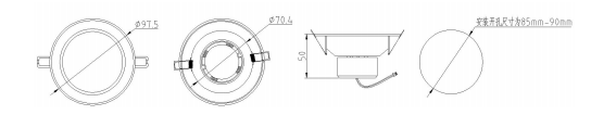 b.嵌頂式燈具安裝:在天花板上開好安裝孔位,相應(yīng)的燈具開孔尺寸為φ97.5mm(或 107.5),天花 板厚度為 1-20mm。將燈具上的彈簧按圖所示方向撐開到可以塞入安裝孔,保持彈簧張開狀態(tài),將燈具放入安裝孔,松開彈簧,此時(shí)彈簧復(fù)位,將燈具固定在天花板上,即完成安裝。
